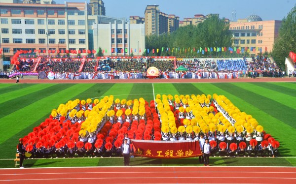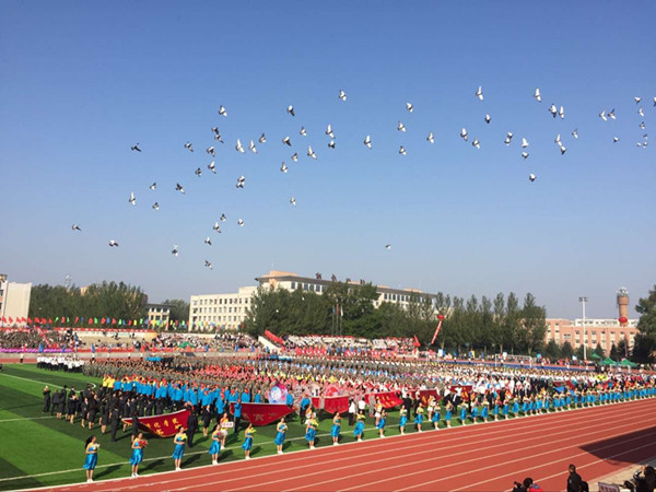 上午8点,激昂的《运动员进行曲》在体育场上空响起,庄严威武的国旗护卫队、英姿飒爽的校旗护卫队、青春洋溢的花束队、铜管军乐队,迎着朝阳,气宇轩昂地走过主席台,拉开了运动员入场式序幕。紧随其后的是各公司方队和机关、后勤、图书馆等16支代表队,他们踏着整齐的步伐,喊着嘹亮的口号,意气风发,英姿勃勃地依次走过主席台,接受检阅。在庄严的国歌声中,五星红旗冉冉升起,运动场上空鸣响十八响礼炮,并放飞了和平鸽。